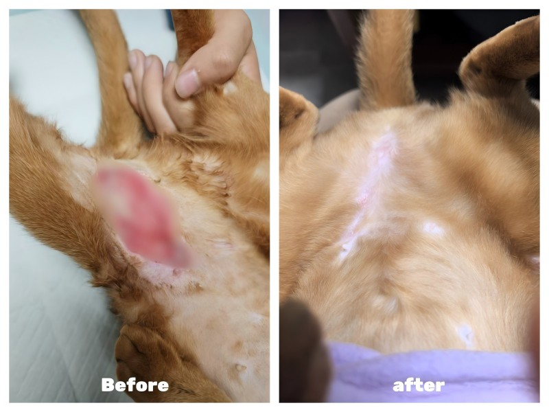 Сәтті босанғаннан кейін, мысық Нюонуо, өкінішке орай, сүт бездері жарылды. Бұл шарт Нуонуоға үлкен ауырсыну әкеліп қана қоймай, жаңадан келген котяттарға да әсер етті. Бұған қарсы тұрып, Руипай Кенуо үй жануарларының ауруханасында ветеринарлық ұжымдар, олардың бай клиникалық тәжірибесіне және кәсіби түсініктерге сүйене отырып, қатаң түрде қолданадыЖетілдірілген ветедикс ветеринариялық лазерНуонуоға дәл емдеу. Дәстүрлі жарақаттану әдістерімен салыстырғанда лазерлік терапия керемет әсер көрсетті. Бұл Нуонуоның сүт бездері жыртылуының емдік кезеңін айтып, өлімге әкеліп соқтырды, сонымен қатар, маңызды емдік эффектілері бар жараларды емдеудің ықтималдығы азайды. Сегіз күндік тиімді кәсіби емдеуден кейін Нуонуодың физикалық жағдайы едәуір жақсарды, ал емдік жағдай жақсы.